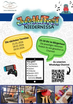 Auch 2026 gibt es wieder die beliebten Jugendtreffs in Niedernissa. An jedem 3. Mittwoch im Monat im Bürgerhaus von 15 bis 18 Uhr können die Kids spielen, zocken, basteln, snacken oder einfach nur chillen. Kommt vorbei!