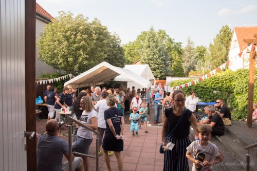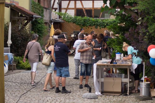 Den Auftakt für unser Festwochenende starteten wir traditionell in der Himmelpforte zu Niedernissa, unserer historischen Kirche. Der Pfarrer Uwe Edom brachte auf interessante Weise die Geschichte unseres Ortes den Besuchern nahe und der Chor sang zum 1. Mal öffentlich das Niedernissa-Lied. Begleitet mit Blecht-Bläsern gab dies dem Jubiläum einen besonders festlichen Rahmen. Dach warteten die Mitglieder unseres Ortsvereins schon bei brennenden Rost und kühlen Drinks und riefen zum gemeinsamen anfeiern. Ein gelungener Auftakt, wie wir fanden.
