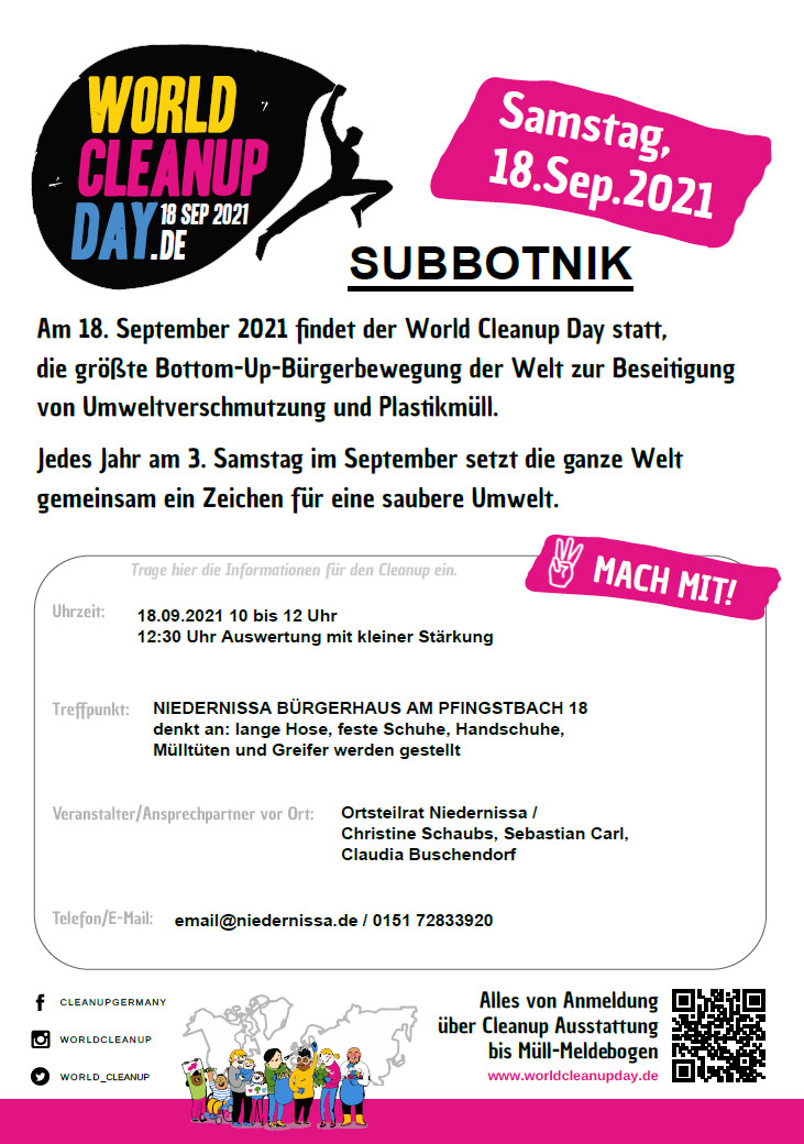 Dankeschön an alle, die beim 2. World Cleanup Day / Subbotnik in Niedernissa mitgemacht haben. Wir haben wieder eine ganze Menge Müll gesammelt und damit etwas für unsere Umwelt getan. Wir waren begeistert wie engagiert unsere Kinder waren.
