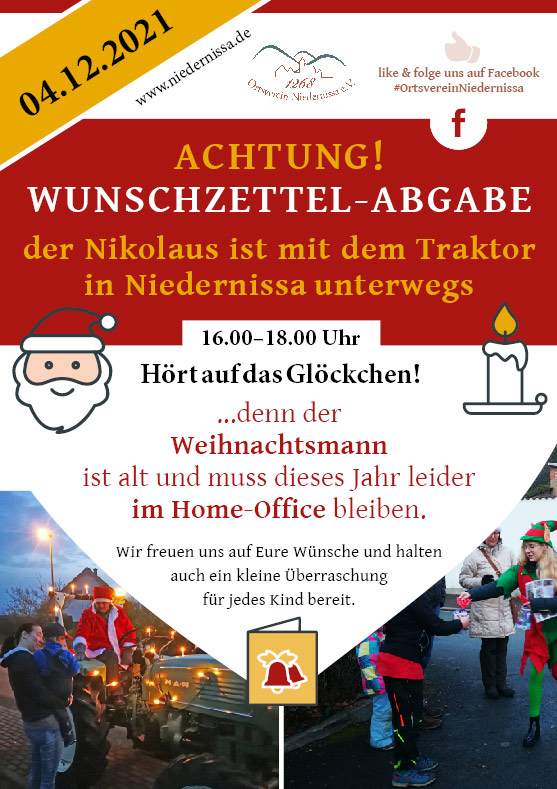Die Ortsteilbürgermeisterin Christine Schaubs, der Nikolaus sowie der Ortsverein Niedernissa e.V. wünschen allen Familien in Niedernissa schöne Weihnachten!
